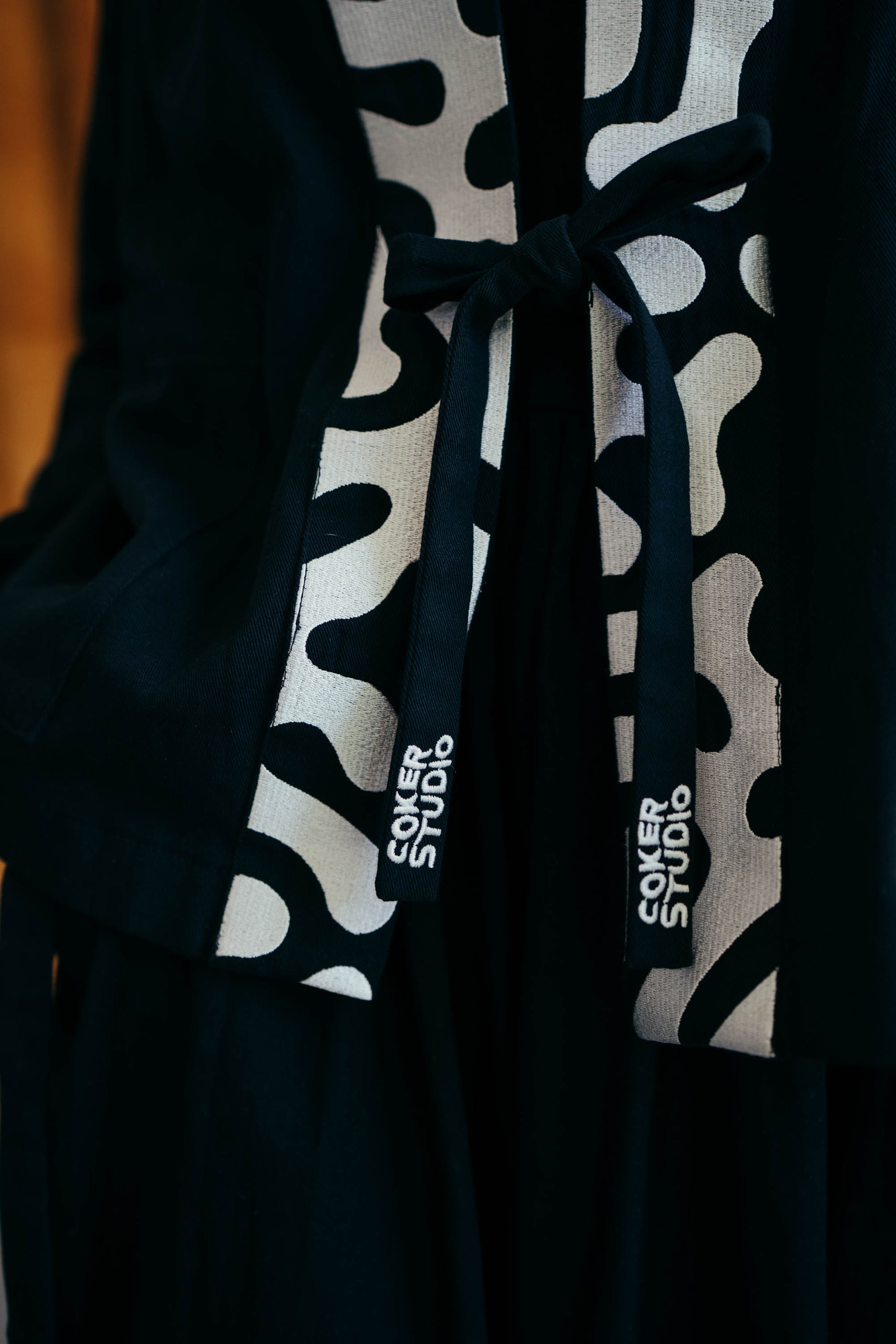 This jacket is designed with a relaxed, boxy fit and adjustable internal ties for flexible styling. It drapes comfortably across the shoulders and chest — meant to be worn open, loosely tied, or fully wrapped.