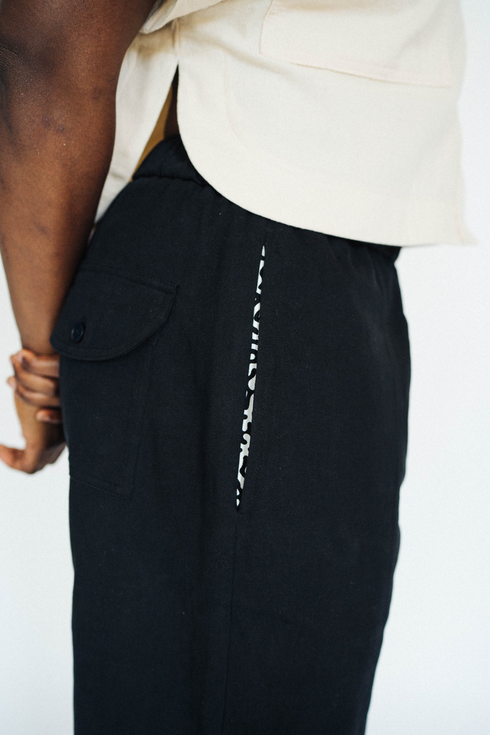 The Asobi Pant is relaxed, breathable, and easy to style up or down. Made from soft cotton with a loose, tapered fit and an elastic waistband for all-day comfort. It features two side pockets, a back flap pocket, and our signature black-and-white print lining the inside pockets a small detail that makes it yours.