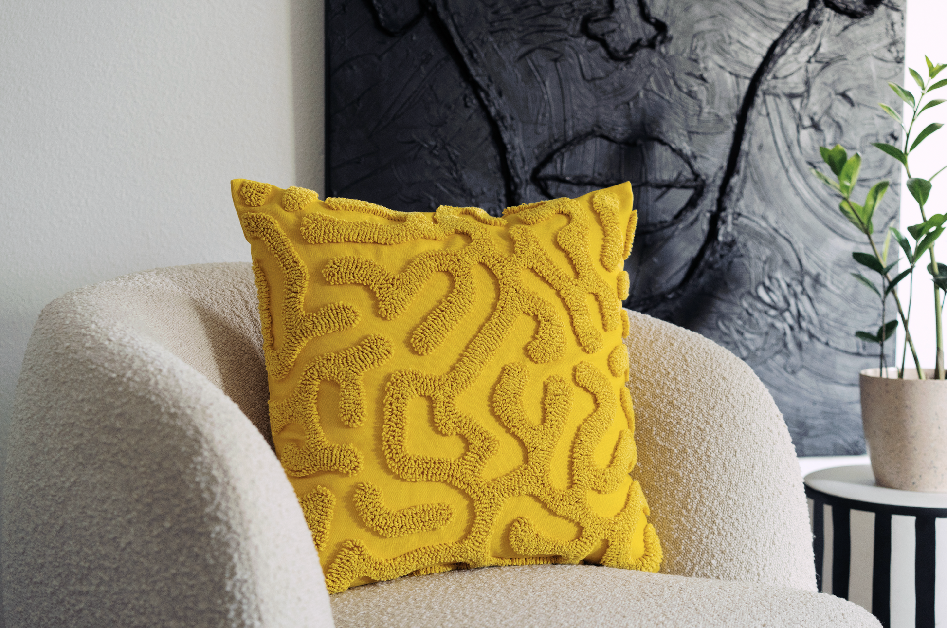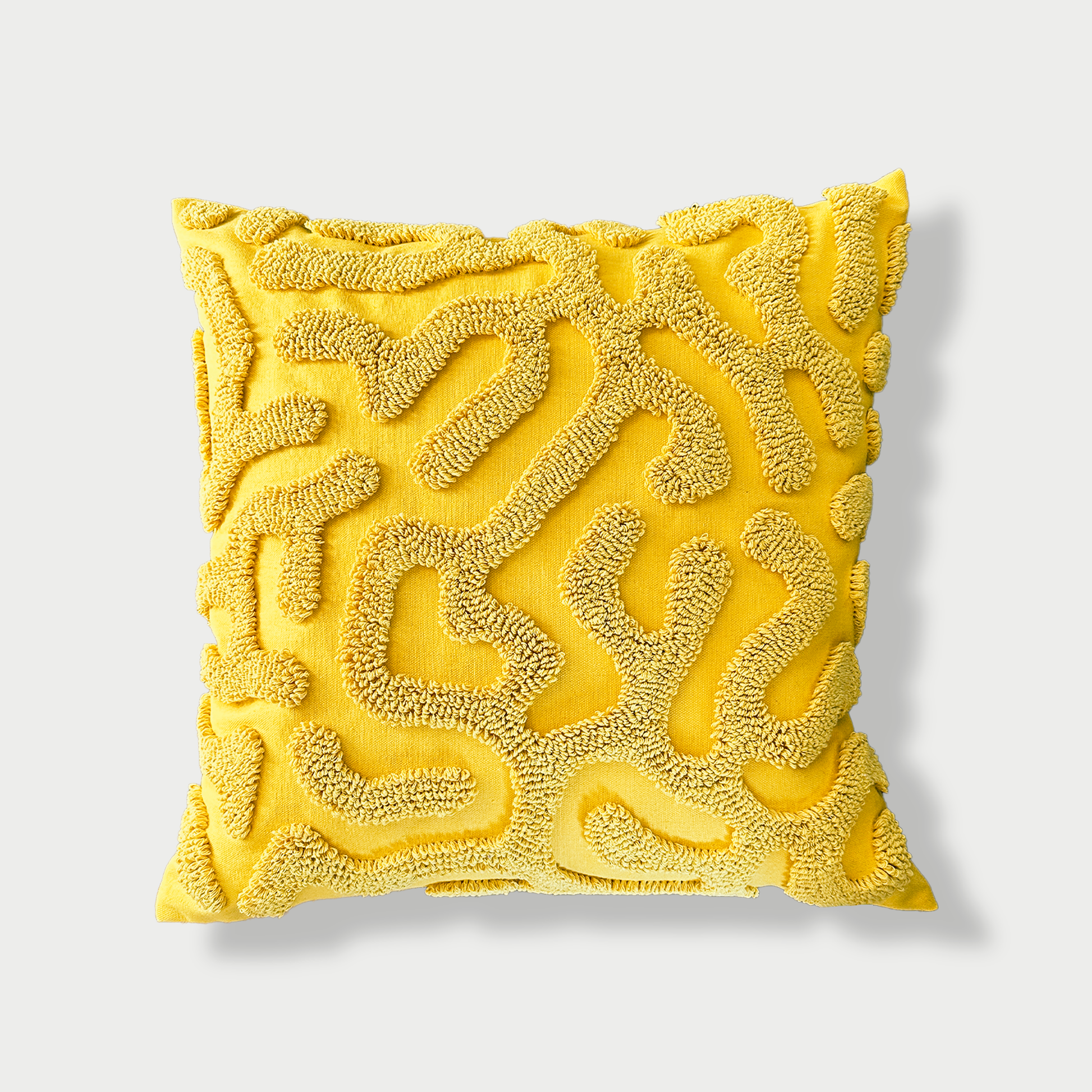 Brighten up your space with this hand-tufted pillow cover, designed with a bold, modern pattern in vibrant yellow. Made from a blend of cotton and polyester linen fabric, and crafted with soft cotton yarn, this cover is all about bringing comfort and style into your home. Perfect as a statement piece or a thoughtful gift.